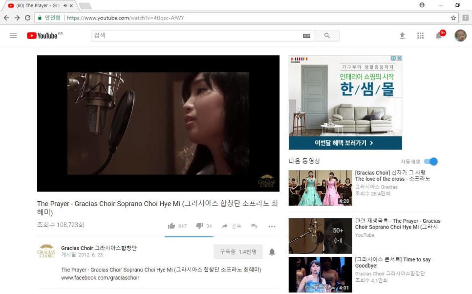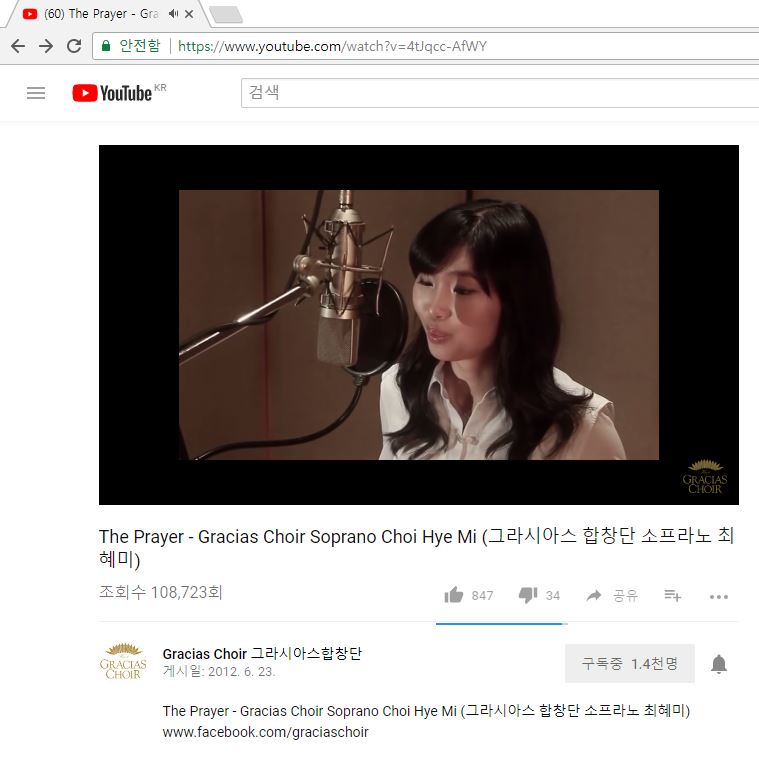 유튜브 사이트로 가셔서 동영상을 찾습니다. 전 테스트로 제가 늘 좋아하는 그라시아스합창단의 음악을 소장하고 싶어서 그걸 선택해 보겠습니다.