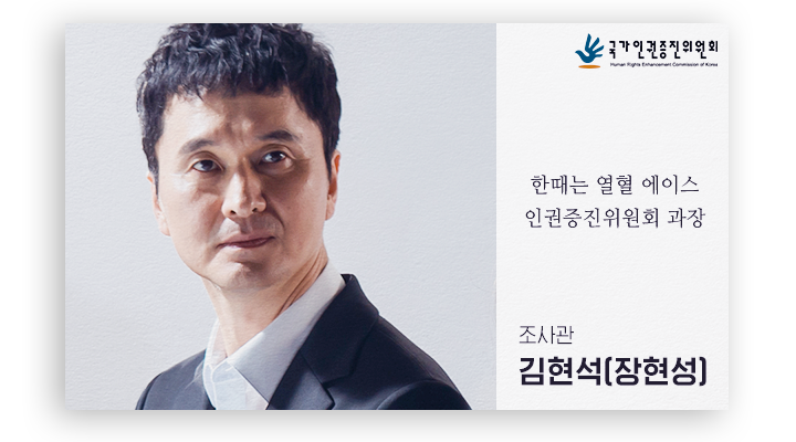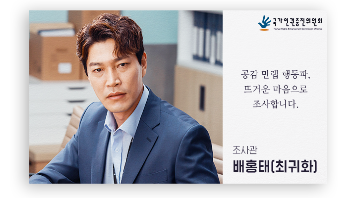 전형적인 과장님 스타일. 인권위 진정에 대해서도 조직 생활에서 몸에 밴 중립의 태도를 보인다. 젊은 시절 한때는 열혈 에이스조사관이었다는 소문만 무성하다. 가끔 예리한 조언을 할 때 보면 소문이 사실이 아닐까 싶지만, 현재는 꼰대 상사가 되지 않기 위해 블로그를 뒤적이거나, 군대 간 아들이 혹시 부당한 대우를 받지는 않을까 인권위 봉투로 편지를 보내는 소심한 가장이자 과장.