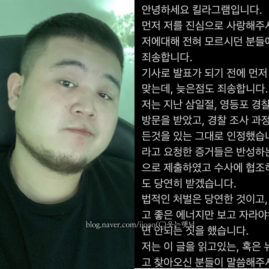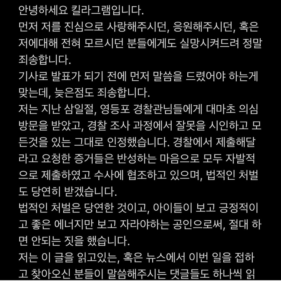 킬라그램이 대마초 흡연에 대해 사과했습니다