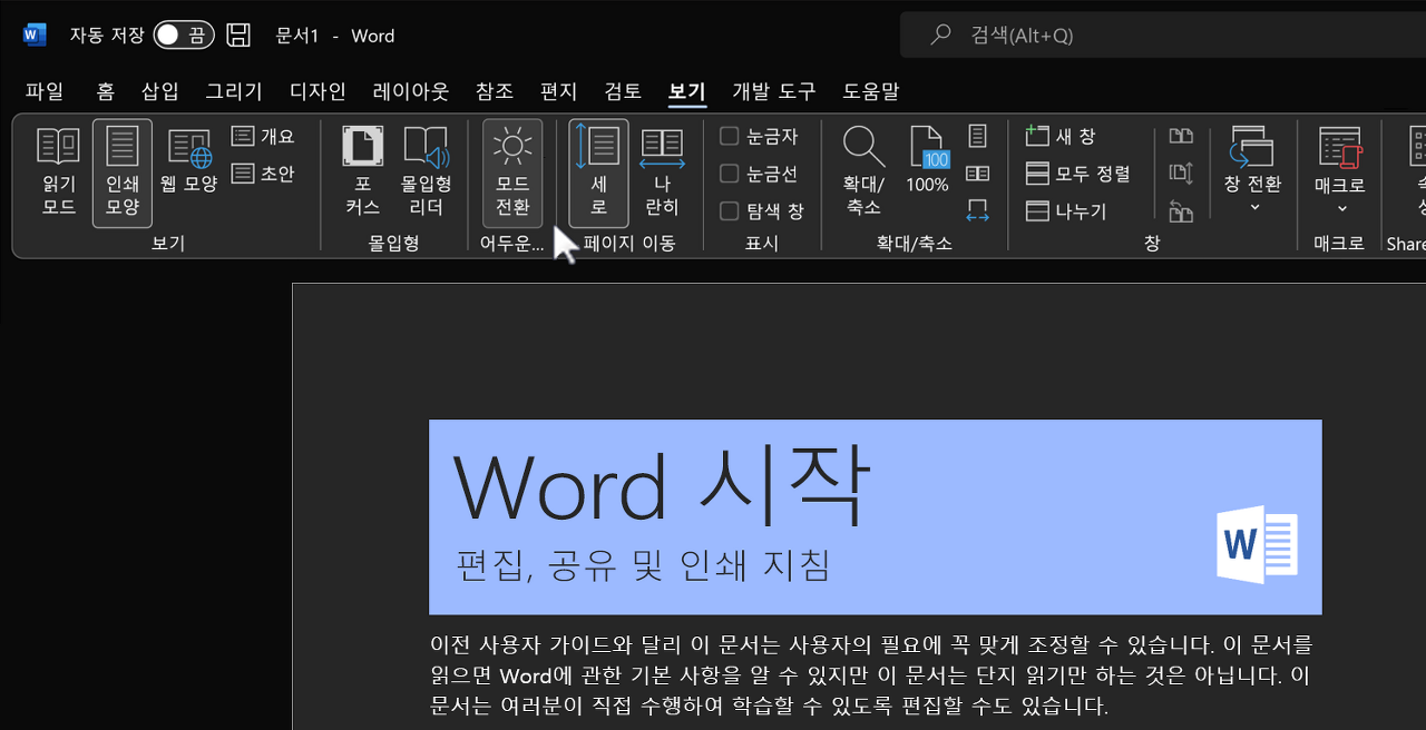 접근성 검사는 문서를 주시하다가 사용자가 주목해야 할 부분을 발견하면 상태 표시줄에 표시합니다. 검토 > 접근성 검사를 클릭하여 사용해 보세요.
