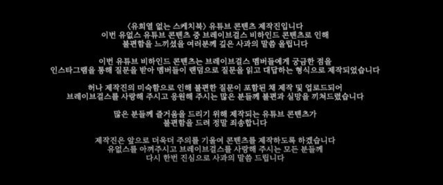 이번 유없스 유튜브 콘텐츠 중 브레이브걸스 비하인드 콘텐츠로 인해 불편함을 느끼셨을 여러분께 깊은 사과의 말씀 올립니다.
