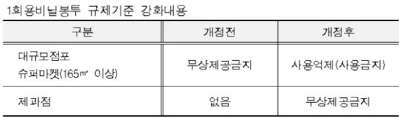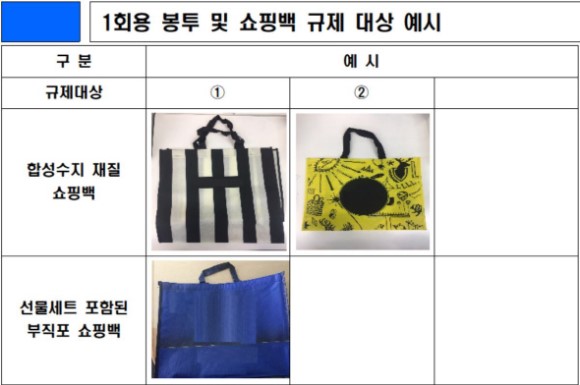 대형마트 등 대규모점포 2000여곳과 165㎡ 이상 슈퍼마켓 1만1000여곳이 대상으로 이들 1만3000여개 매장에서는 일회용 봉투 및 쇼핑백을 사용할 수 없습니다. 제공하다 적발되면 위반 횟수에 따라 최대 300만원까지 과태료가 부과됩니다. 대규모점포 및 슈퍼마켓에 입점한 모든 업체가 규제 대상이며 점포 내 입점한 임대업체가 규정을 어겼을 경우엔 입점 업체를 관리·운영하는 주체에게 과태료가 부과됩니다.