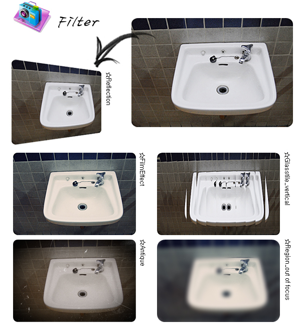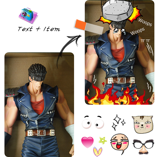 -사진편집: 크기/밝기/색상 조절, 역광보정, 액자, 말풍선, 모자이크, 글쓰기, 그리기, 자르기, 필터, 적목보정, 뽀샤시, 복제도장툴