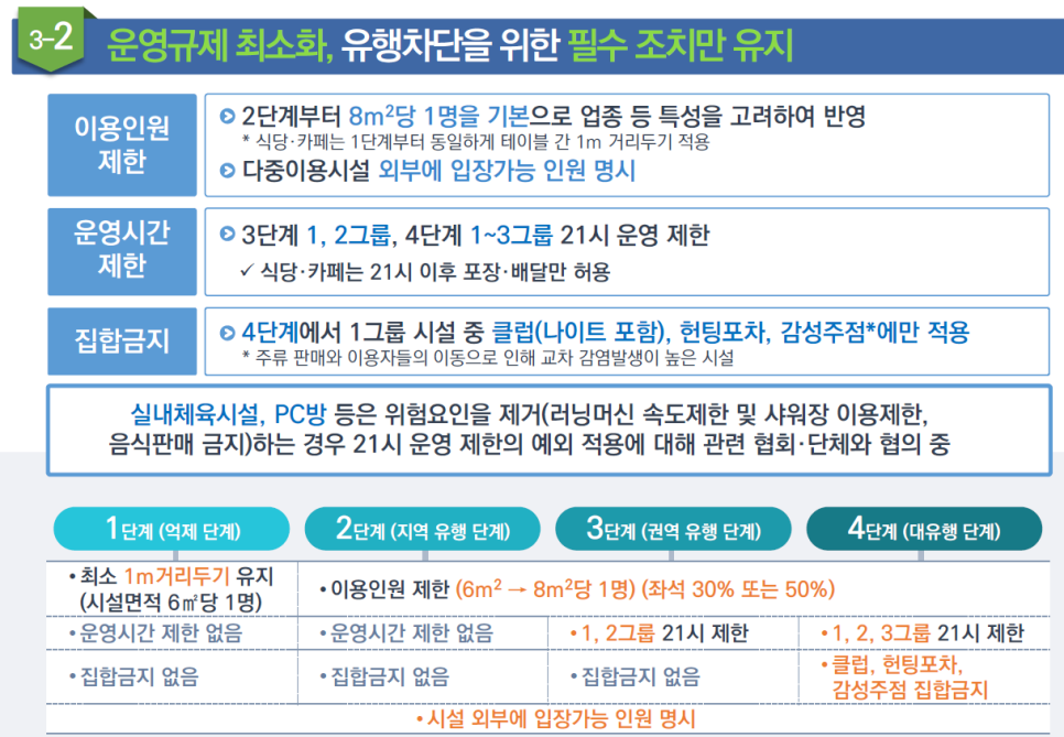 그리고 3단계로 올라가더라도 모든 그룹이 운영은 가능합니다. 단, 1,2그룹의 경우 21시까지 제한이 되겠죠..