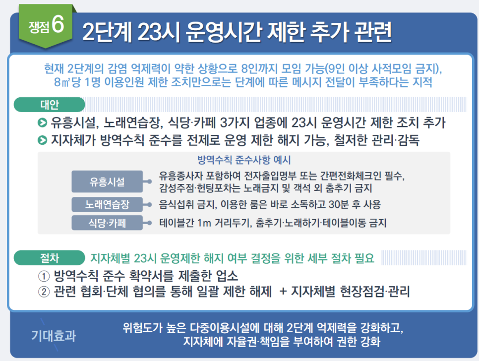 2단계에서는 운영시간의 제한이 없습니다. 즉, 개편안 도입 할 때 현행 확진자 수준과 비슷하다면(전국기준 일 778명 이하).. 2단계가 적용될텐데 그럼 운영시간 제한은 없어지는거죠.