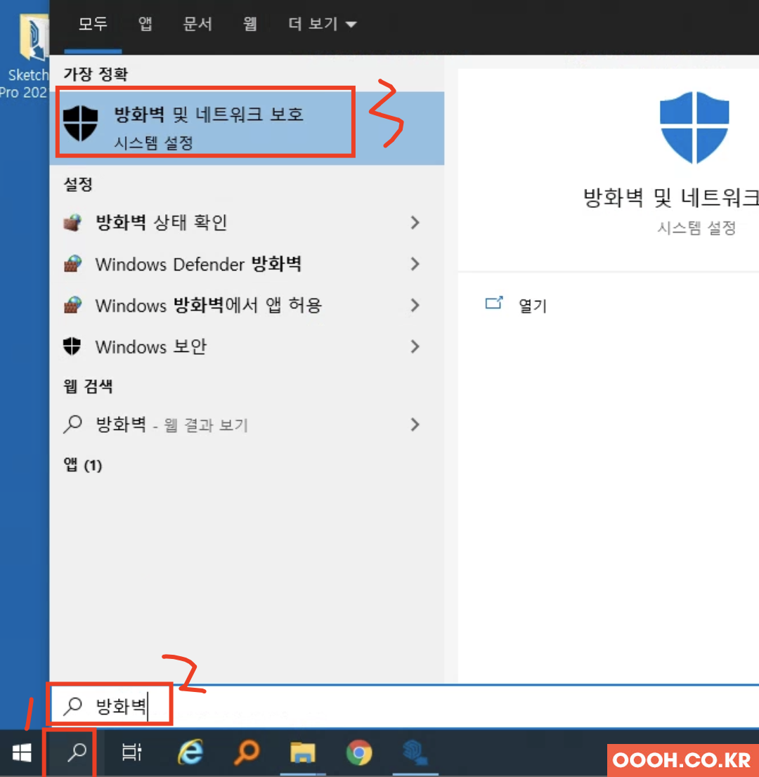 시작 버튼 옆에 돋보기를 누르고 "방화벽" 이라고 치면 나오는 메뉴를 클릭합니다.