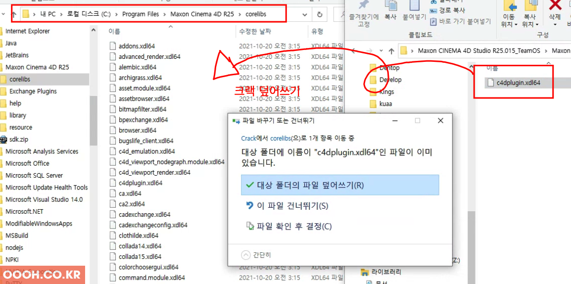 설치파일중 Crack 폴더에 들어가면 c4dplugin.xdl64 이 파일을 복사하여