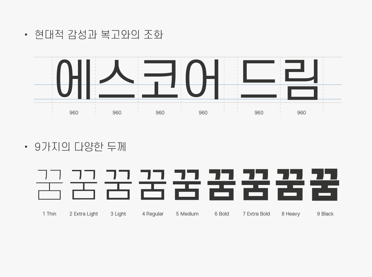 에스코어 드림은 ‘Dream(꿈)’과 ‘드리다’라는 두 가지 뜻을 가지고 있습니다. 꽉 찬 직사각형 구조의 제목용 글꼴로써 복고적인 형태에 현대적인 감성을 담았습니다. 각 자소에서 보여지는 수직적인 획의 마감은 전체적인 구조와 어우러져 새로운 글꼴의 표정을 제시합니다.