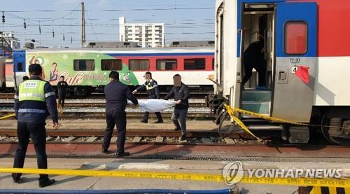 29일 오후 2시 30분께 대전에서 출발, 제천에 도착한 충북선 무궁화 1707호 열차 화장실 변기 내부에서 신생아가 숨져 있는 것을 청소하던 코레일 하청업체 관계자가 발견했다. 사진은 열차에서 숨진 채 발견된 신생아를 옮기는 경찰