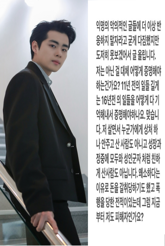 저는 아닌 걸 대체 어떻게 증명해야 하는 건가요? 11년 전의 일들 길게는 16년 전의 일들을 어떻게 다 기억해내서 증명해야 하나요. 맞습니다. 저 살면서 누군가에게 상처 하나 안 주고 산 사람도 아니고 성장 과정 중에 모두와 성인군자처럼 친하게 산 사람도 아닙니다. 왜소하다는 이유로 돈을 갈취당하기도 했고 폭행을 당한 전적이 있는데 그럼 지금부터 저도 피해자인가요?