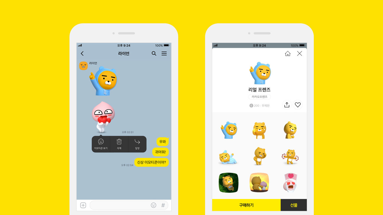카카오프렌즈 이모티콘 뿐 아니라 더 많은 재미있는 이모티콘으로 카카오톡을 즐기세요. 채팅방의 이모티콘을 롱탭 하면 친구들이 가지고 있는 이모티콘을 자세히 볼 수 있습니다.