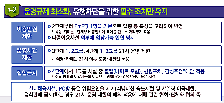 카페나 식당 등의 영업시간 등의 조치에 대해 논란이 많았던 걸 감안했던 것으로 보이는데요. 가능한 운영규제를 최소화하고 필수 조치를 하는 쪽으로 가닥을 잡은 것으로 보여요.