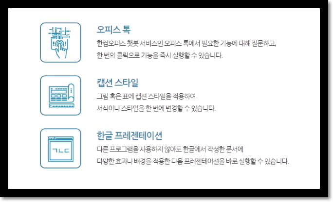 한컴오피스 챗봇 서비스인 오피스 톡에서 필요한 기능에 대해 질문하고,