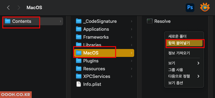 DaVinci Resolve.app > 패키지 내용 표시를 마우스 오른쪽 버튼으로 클릭합니다.