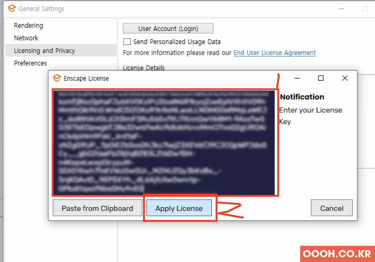 다시 스케치업으로 돌아와서 하단에 Enter License Key를 눌르고 나오는 창에 복사된 키를 붙여넣습니다.