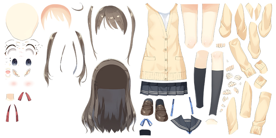 Live2D는 원화 자체를 변화시킴으로써 입체 표현을 실현합니다. 이 때문에 반드시 최소 한 장의 원화(일러스트)가 있어야 합니다. 원화는 움직이고자 하는 파트별로 구분해 둡니다.
