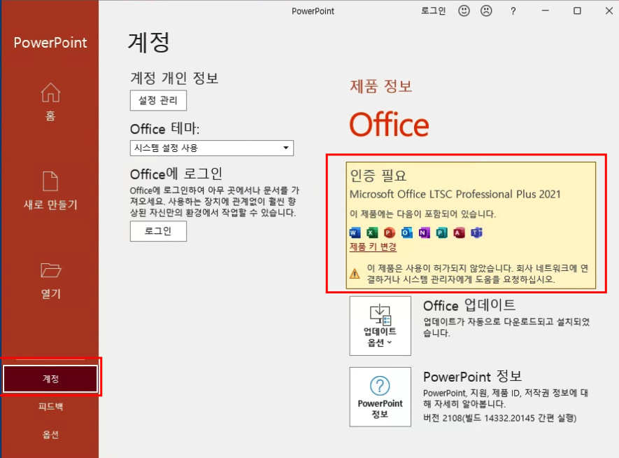 오피스 툴을 다시켜고 인증이 잘 되었는지 체크합니다.