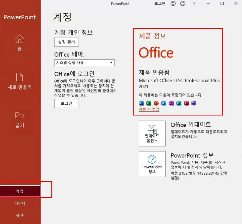 오피스 툴을 다시켜고 인증이 잘 되었는지 체크합니다.