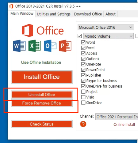 아래 Force Remove Office 강제삭제 메뉴를 이용하세요