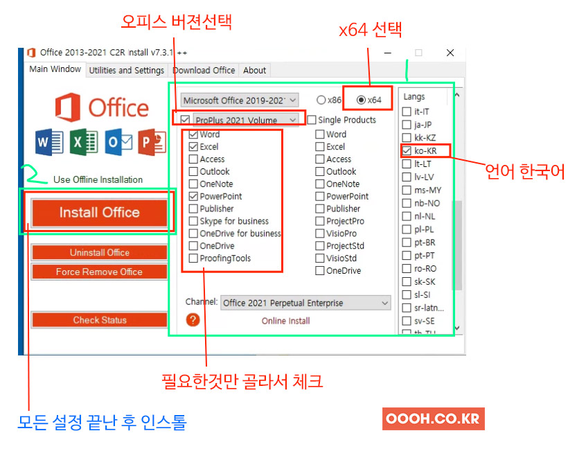 이 프로그램은 Microsoft Office 2013/2016/2019/2021 C2R의 온라인 설치 및 활성화를 위해 설계되었습니다