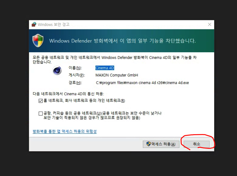 방화벽 허용 안하기 위해 취소