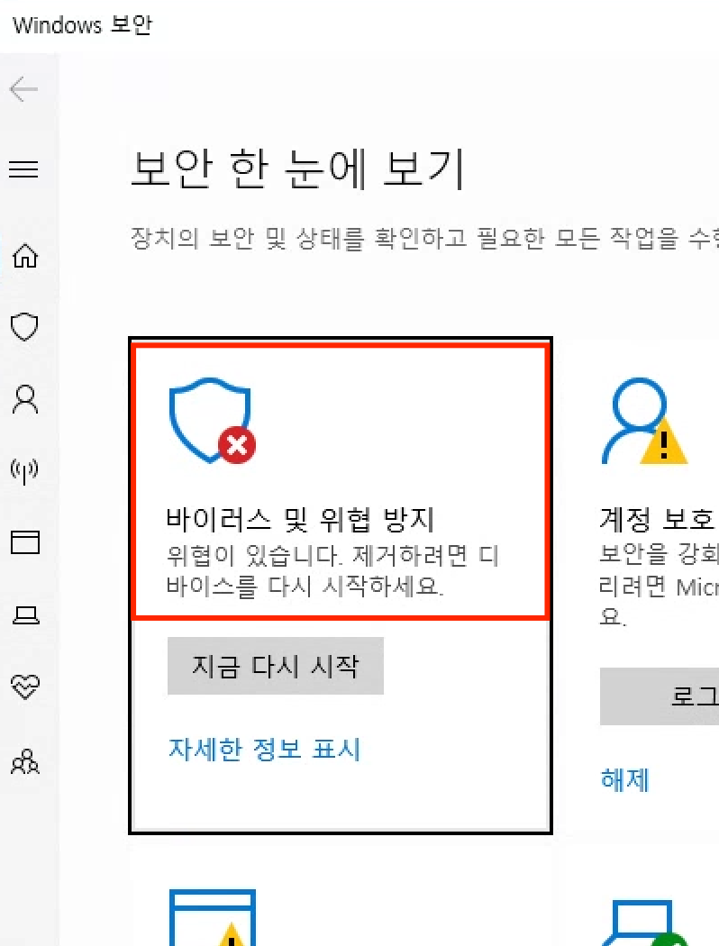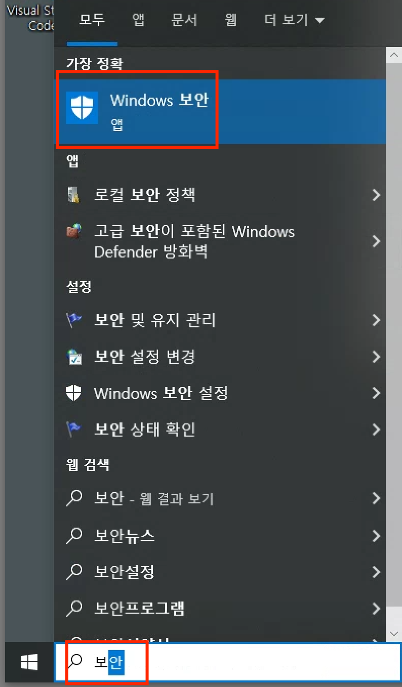 ▼ 시작 누르고 "보안" 입력 윈도우즈 보안 클릭