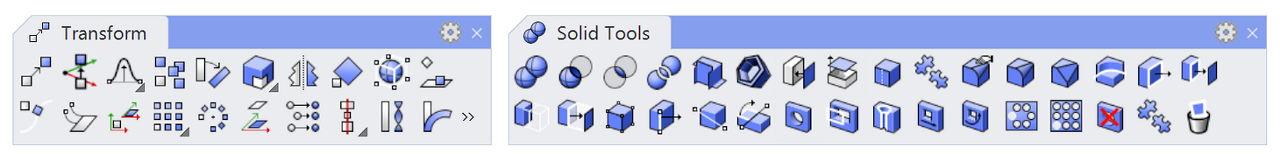 변형 도구: 잘라내기, 복사, 붙여넣기, 이동, 회전, 미러, 크기 조정, 스트레치, 정렬, 배열, 비틀기, 구부리기, 테이퍼, 기울이기, 간격띄우기, 방위 지정, 커브를 따라 흐름, 끌어오기, 투영, 상자 편집, 스매시, 스퀴시.