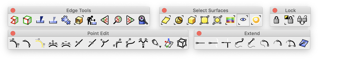 서피스: 제어점, 핸들막대, 차수 변경, 매듭점 추가/제거, 일치, 연장, 병합, 결합, 트림 해제, 아이소팜 기준으로 서피스 분할, 재생성, 축소, 주기화, 부울 연산 (합집합, 차집합, 교집합), 전개 가능한 서피스 펼치기, 서피스상의 커브를 따라 배열.