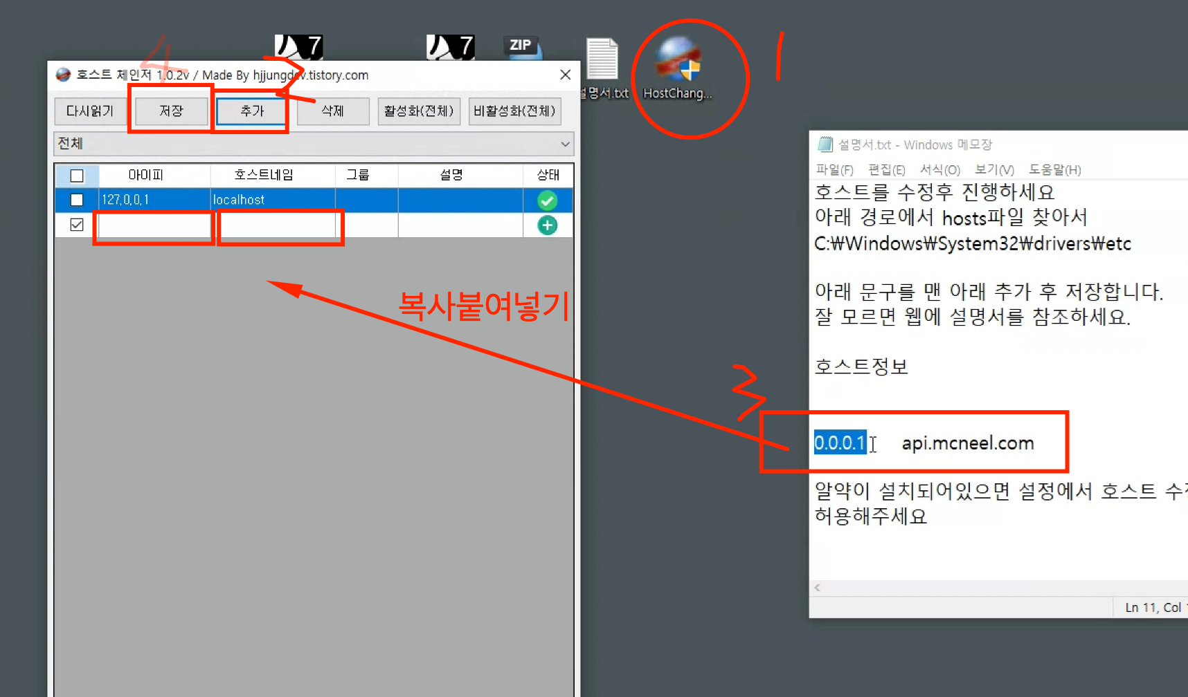 3. 설명서에 있는 아이피를 복사붙여넣기 합니다. 0.0.0.1 api.mcneel.com