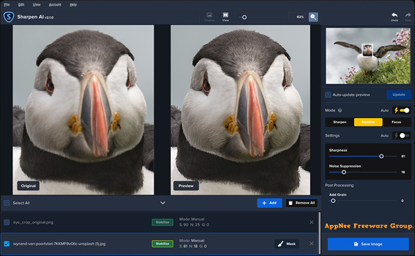 매우 강력한 이미지 노이즈 감소 소프트웨어인 Sharpen AI는 AI 기술을 사용하여 이미지를 확인하고 이 이미지 전체의 실제 세부 사항과 노이즈 간의 차이를 확인한 다음 노이즈를 제거하여 원본 이미지의 세부 사항을 복원합니다. 또한 사진에 흔들림의 영향을 효과적으로 줄일 수 있습니다. 핸드헬드 장치로 촬영할 때나 야간 또는 얕은 피사계 심도에서도 Sharpen AI를 사용하면 여전히 선명한 이미지를 만들 수 있습니다.