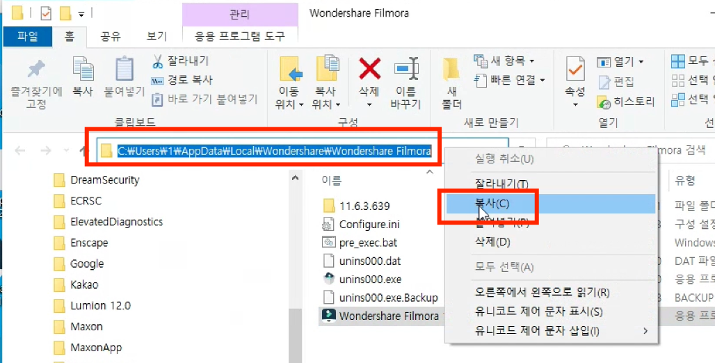 위치가 열리면 필모라 설치 경로를 복사합니다.