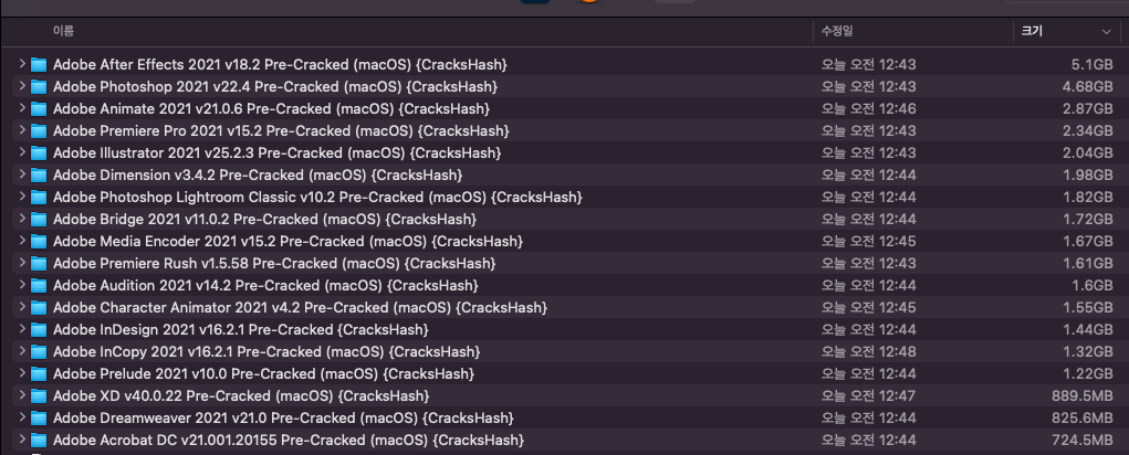 맥용 마스터 컬렉션입니다. 용량이 크니 토렌트로 받으셔야해요~ 어도비 마스터 컬렉션 CC 2021 맥용 - 정품인증크랙 다운로드