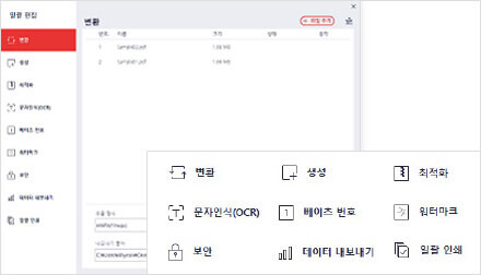 여러 개의 문서에 대해 같은 작업을 적용할 수 있습니다. 변환, 최적화, OCR, 워터마크, 일괄 인쇄 등의 기능을 지원합니다.