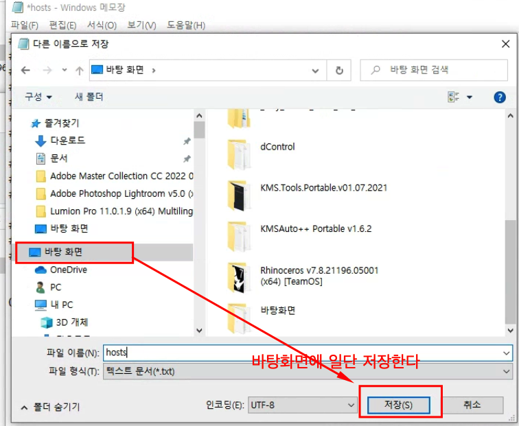 바탕화면에 hosts파일을 저장한다.