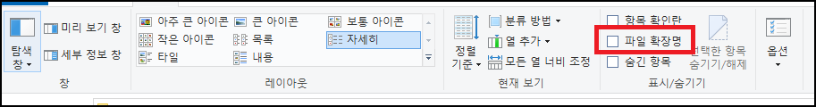 해당 항목에 체크를 하면 파일 확장자를 볼 수 있습니다.