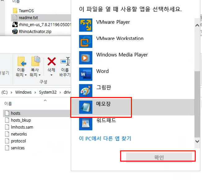 hosts파일에서 오른쪽키를 누르고 연결프로그램을 클릭한다.