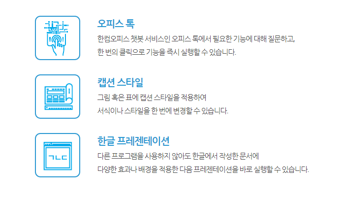 한컴오피스 챗봇 서비스인 오피스 톡에서 필요한 기능에 대해 질문하고,