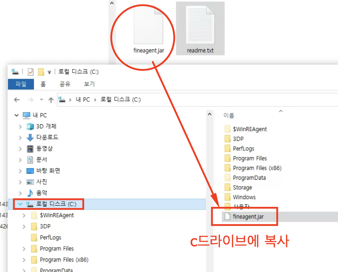 2. Windows의 경우: fineagent.jar을 C 드라이브에 복사합니다.