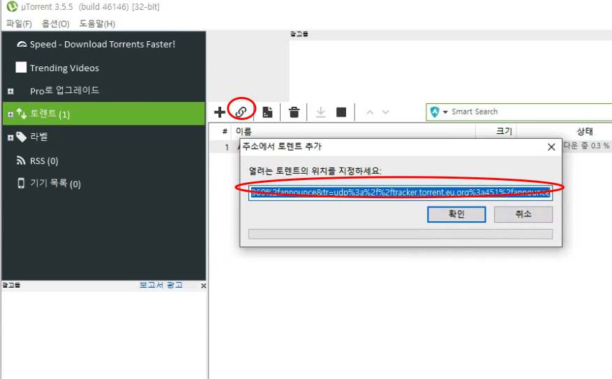 마그넷 링크를 붙여넣고 확인하면 추가됨