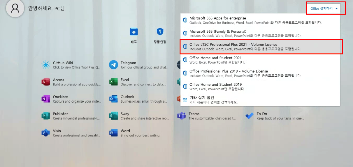 몇가지 버젼을 추천하는데  Office LTSC Pro Plus 2021 -Volume 추천한다.