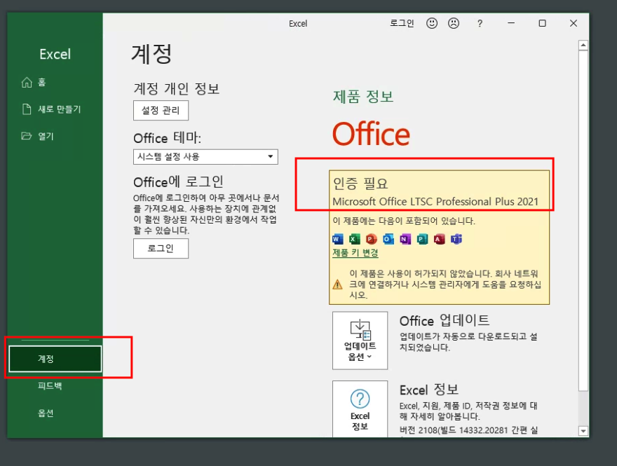 오류3. 오피스 계정메뉴에서 정품확인을 했는데 버젼이 2016이나 다른 버젼으로 뜹니다.