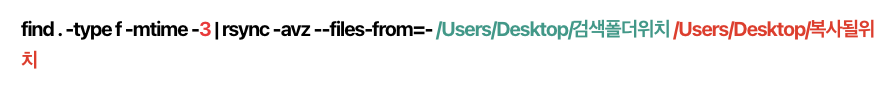 find . -type f -mtime -3 | rsync -avz --files-from=- /Users/Desktop/검색폴더위치 /Users/Desktop/복사될위치